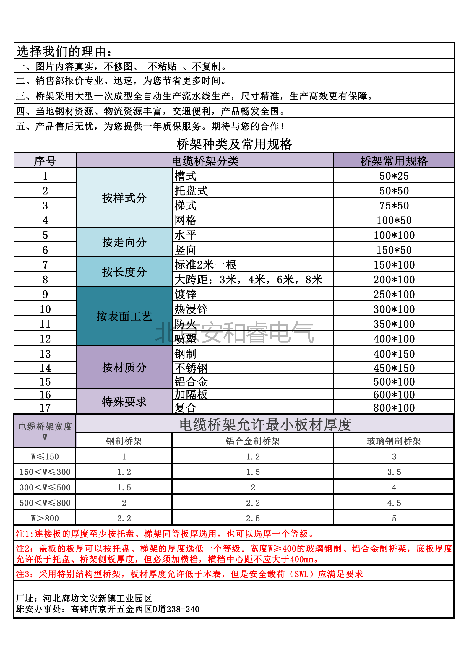 北京安和睿電氣有限公司是一家專業(yè)制造銷售電纜橋架、金屬穿線管、C型鋼-抗震支架及配件的生產(chǎn)廠家。橋架品類有:槽式電纜橋架、梯式電纜橋架、托盤(pán)式電纜橋架、大跨距電纜橋架、網(wǎng)格橋架、不銹鋼橋架、鋁合金橋架,橋架表面處理有:鍍鋅、防火、噴塑、熱浸鋅等。金屬穿線管品類有:套接緊定式鍍鋅導(dǎo)管(JDG)與扣壓式(KBG)熱鍍鋅金屬穿線管及相關(guān)配件??拐鹬Ъ茴惍a(chǎn)品有:抗震支架、管廊支架、綜合支吊架等建筑支架。歡迎新老客戶們來(lái)廠考察指導(dǎo)!