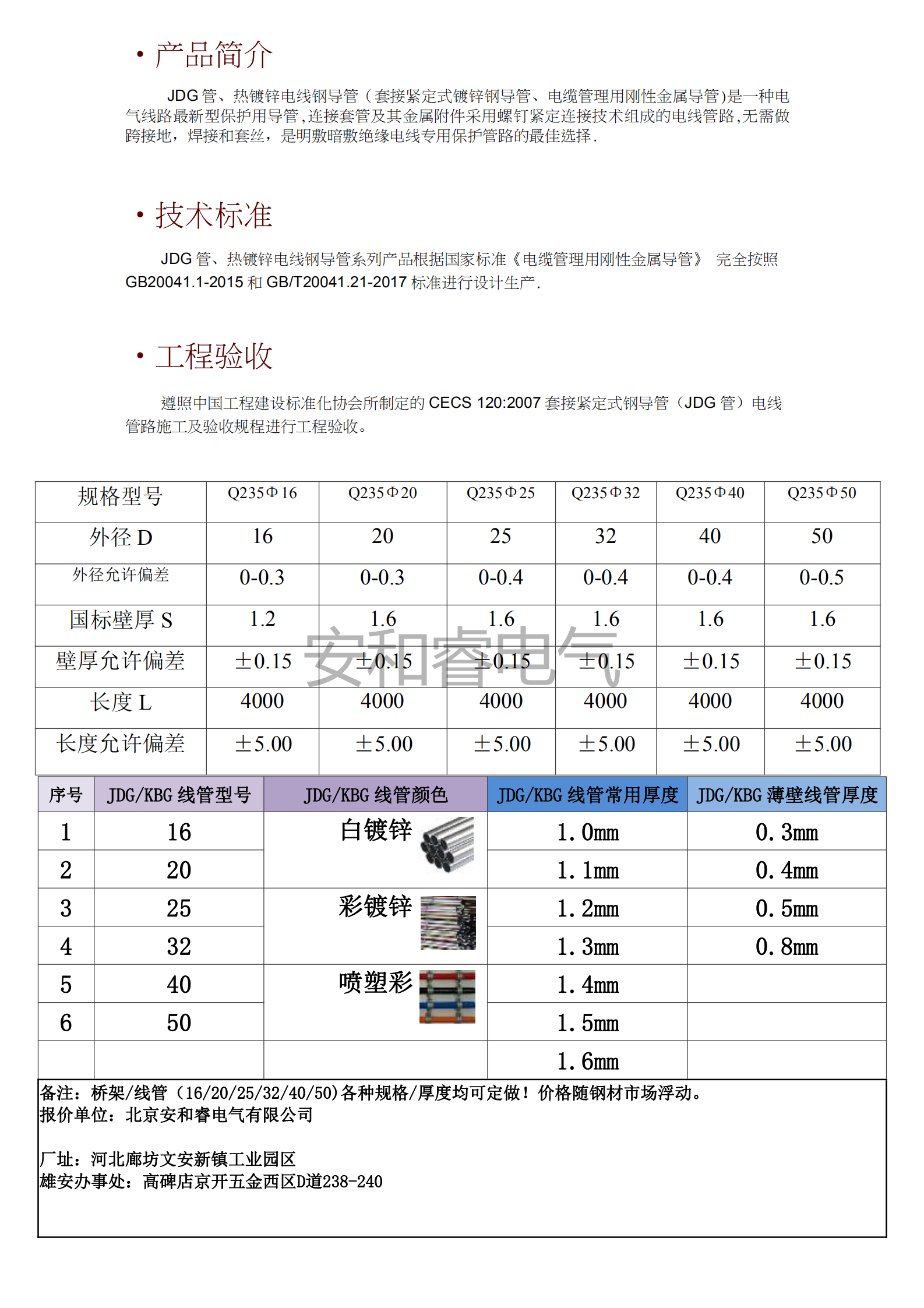 北京安和睿電氣有限公司是一家專業(yè)制造銷售電纜橋架、金屬穿線管、C型鋼-抗震支架及配件的生產(chǎn)廠家。橋架品類有:槽式電纜橋架、梯式電纜橋架、托盤式電纜橋架、大跨距電纜橋架、網(wǎng)格橋架、不銹鋼橋架、鋁合金橋架,橋架表面處理有:鍍鋅、防火、噴塑、熱浸鋅等。金屬穿線管品類有:套接緊定式鍍鋅導(dǎo)管(JDG)與扣壓式(KBG)熱鍍鋅金屬穿線管及相關(guān)配件??拐鹬Ъ茴惍a(chǎn)品有:抗震支架、管廊支架、綜合支吊架等建筑支架。歡迎新老客戶們來廠考察指導(dǎo)!